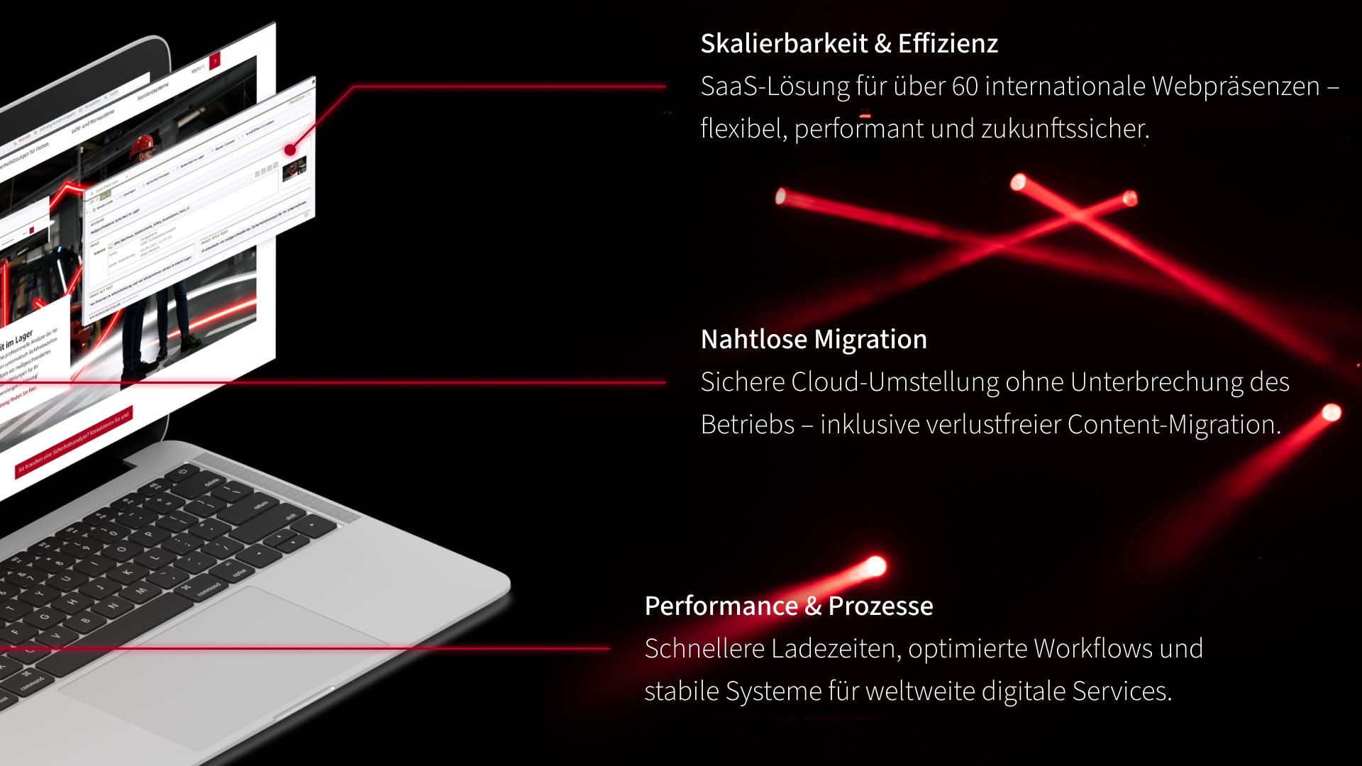 Der Fokus lag auf einer strukturierten und risikoarmen Migration der bestehenden Webprojekte in die SaaS-basierte Cloud-Plattform. Um die gewohnten redaktionellen Abläufe zu erhalten, wird das bewährte CMS FirstSpirit weiterhin eingesetzt, während die technische Basis komplett auf eine skalierbare Cloud-Architektur umgestellt wurde.